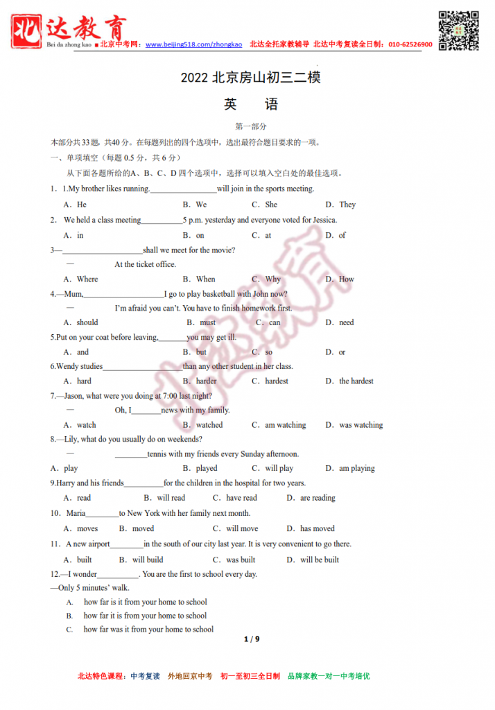 北京房山2022初三二模英语试题及答案(高清版)!admw360中考复读学校教研组收集整理,分享给大家。