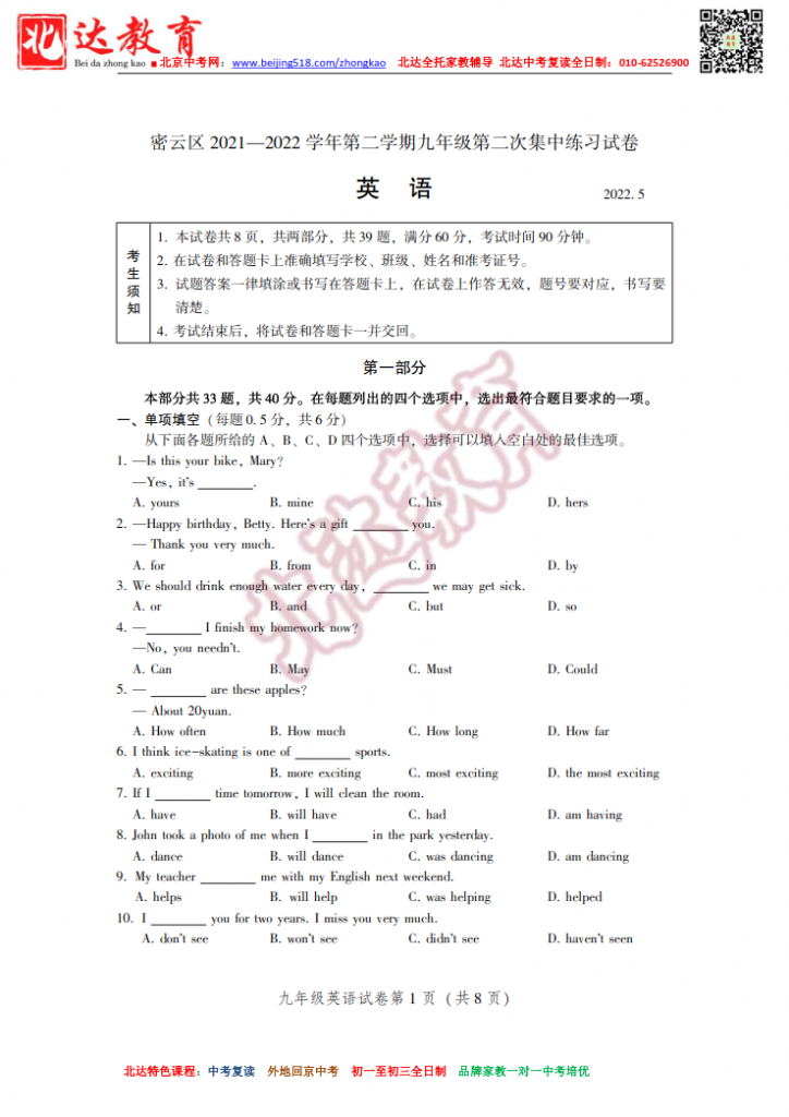 北京密云2022初三二模英语试题(高清版)!admw360中考复读学校教研组收集整理,分享给大家。