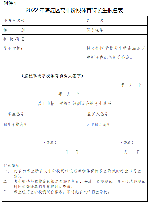 从附件1下载2022年中招体育特长生报名表,填写相关信息并加盖学校章,参加考试时必须携带。