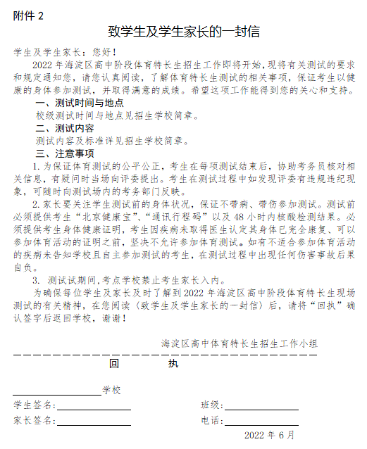 认真阅读附件2《致学生及学生家长的一封信》,家长及学生签字,测试时上交回执,否则不得参加测试。
