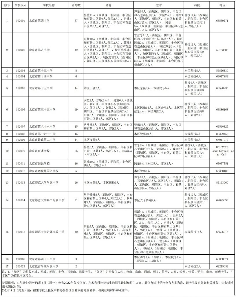 西城区2022中招体育艺术科技项目特长生招生计划公布,具体多少人?admw360中考复读学校教研组收集整理,分享给大家。