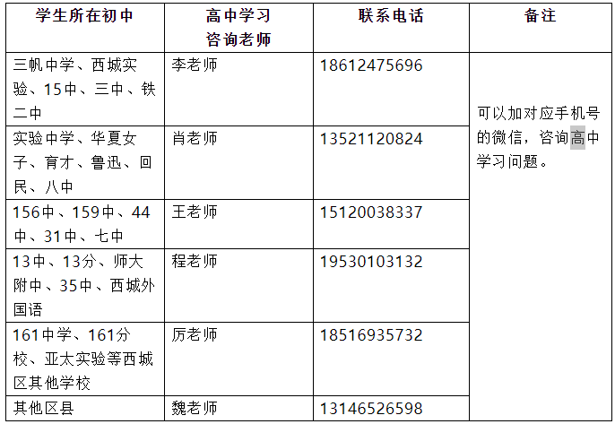 1、由于6月7日-10日为高考周,为方便考生、家长咨询,可以按对应初中校拨打以下电话或添加微信进行咨询: