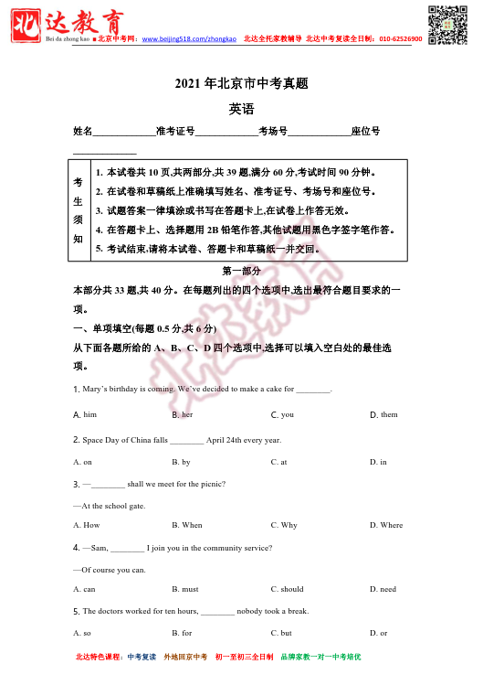 2021年北京中考英语试题及答案汇总。admw360教研组收集整理,分享给大家。