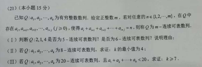对于一个从1开始的连续自然数集合,比如{1,2,3,4,5},这里面的一个数n,比如5,也许可以从2,1,4中找到连续几个数,使得这几个数的和恰好是n。比如1+4=5。也许做不到。如果对{1,2,3,4,5}中的每一个数都可以这样做,那么我们就说2,1,4是5-连续可表数列。注意的是,可以是几个数相加,也可以是一个数。第一问就是问,2,1,4是否为5-连续可表数列。事实上是的: