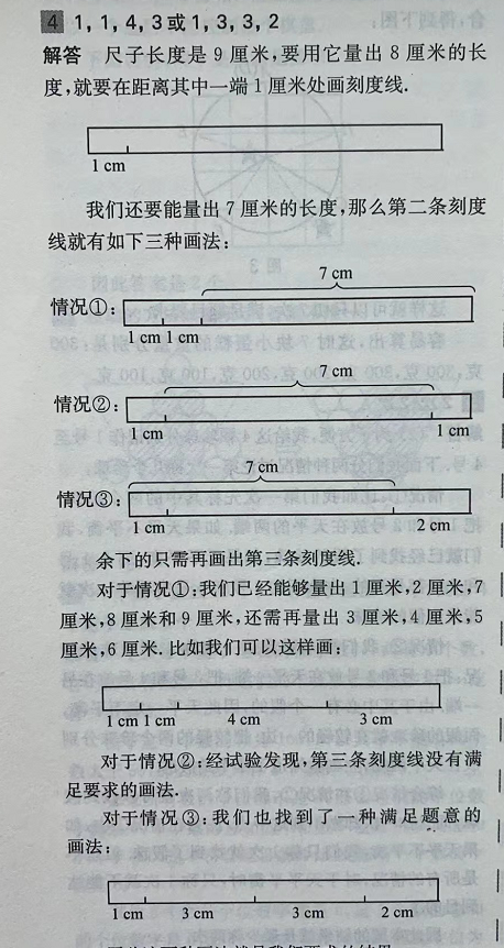 事实上,如果象上面的尺子一样,只有3段(中间2个刻度),那么连同端点一起共4个点,这4个点构成6条一段,就算每条线段长度都不相等,也只能量出6个长度,不可能最出1~8cm.