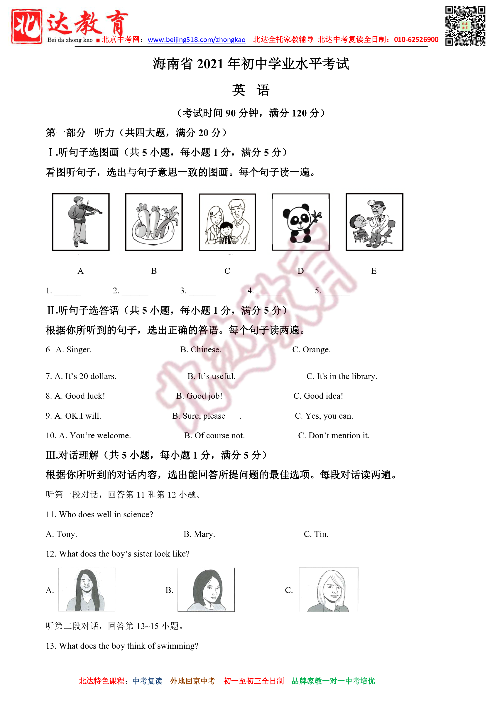 2021年海南中考英语试题及答案汇总。admw360教研组收集整理,分享给大家。