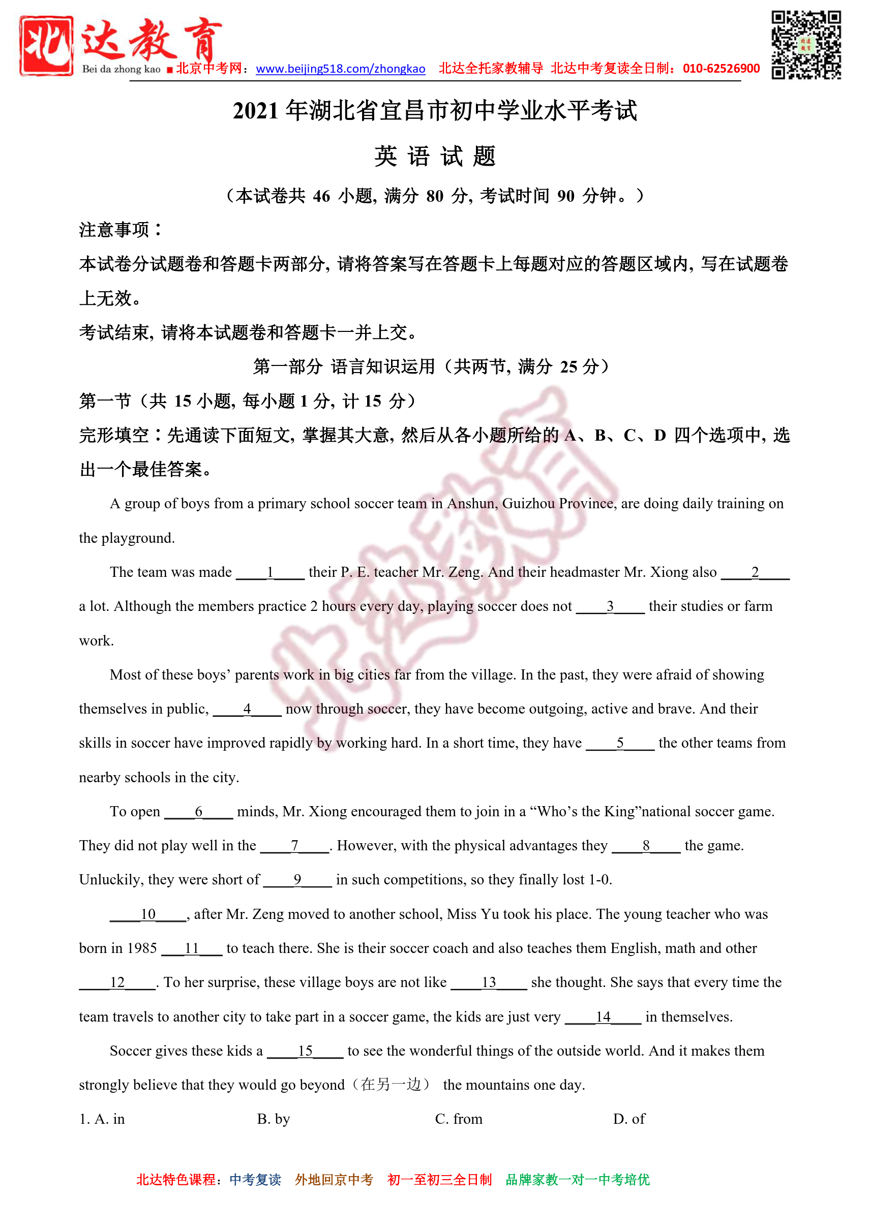 2021年湖北省宜昌市中考英语试题(原卷版)