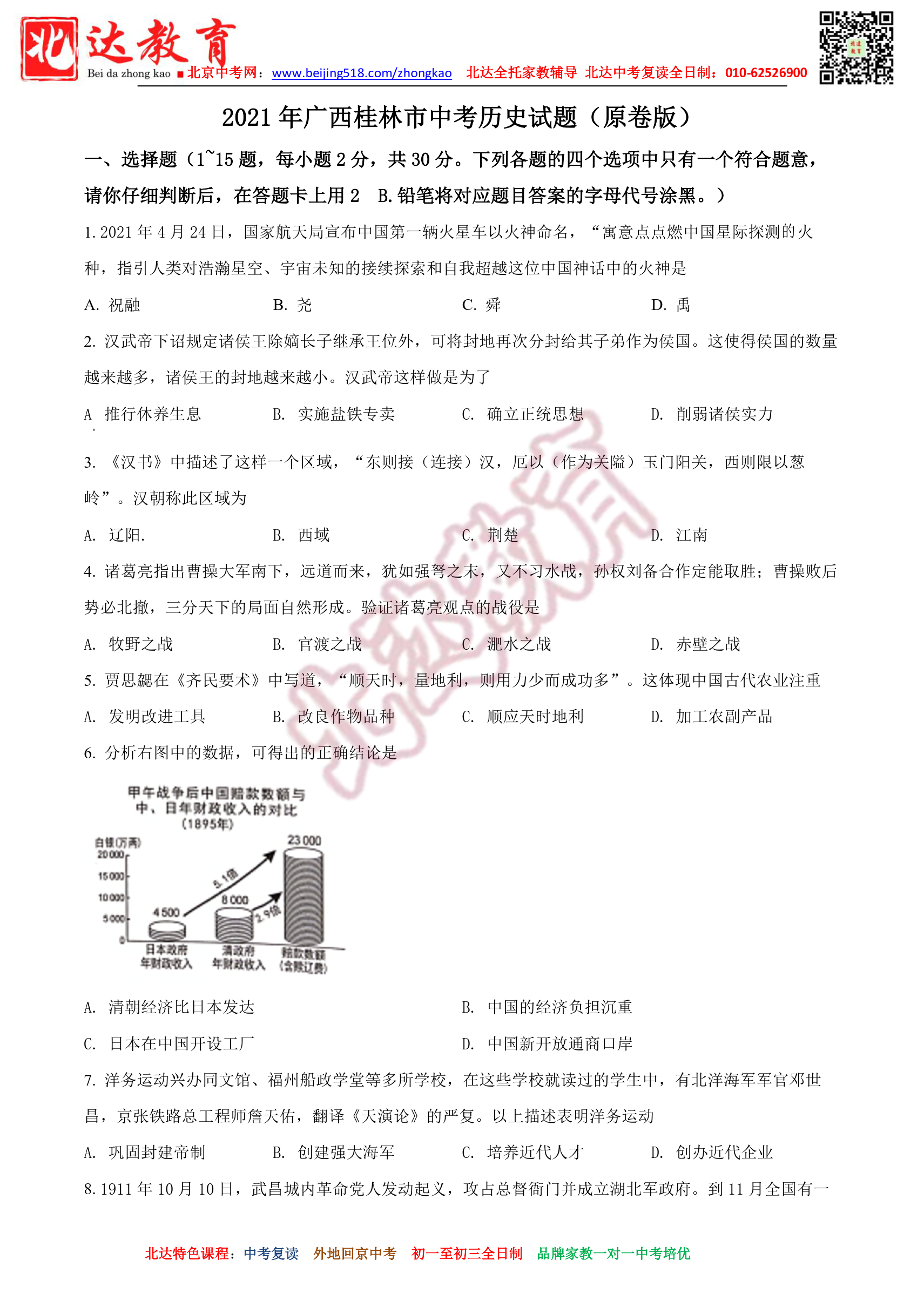 2021年广西中考历史试题及答案汇总。admw360教研组收集整理,分享给大家。