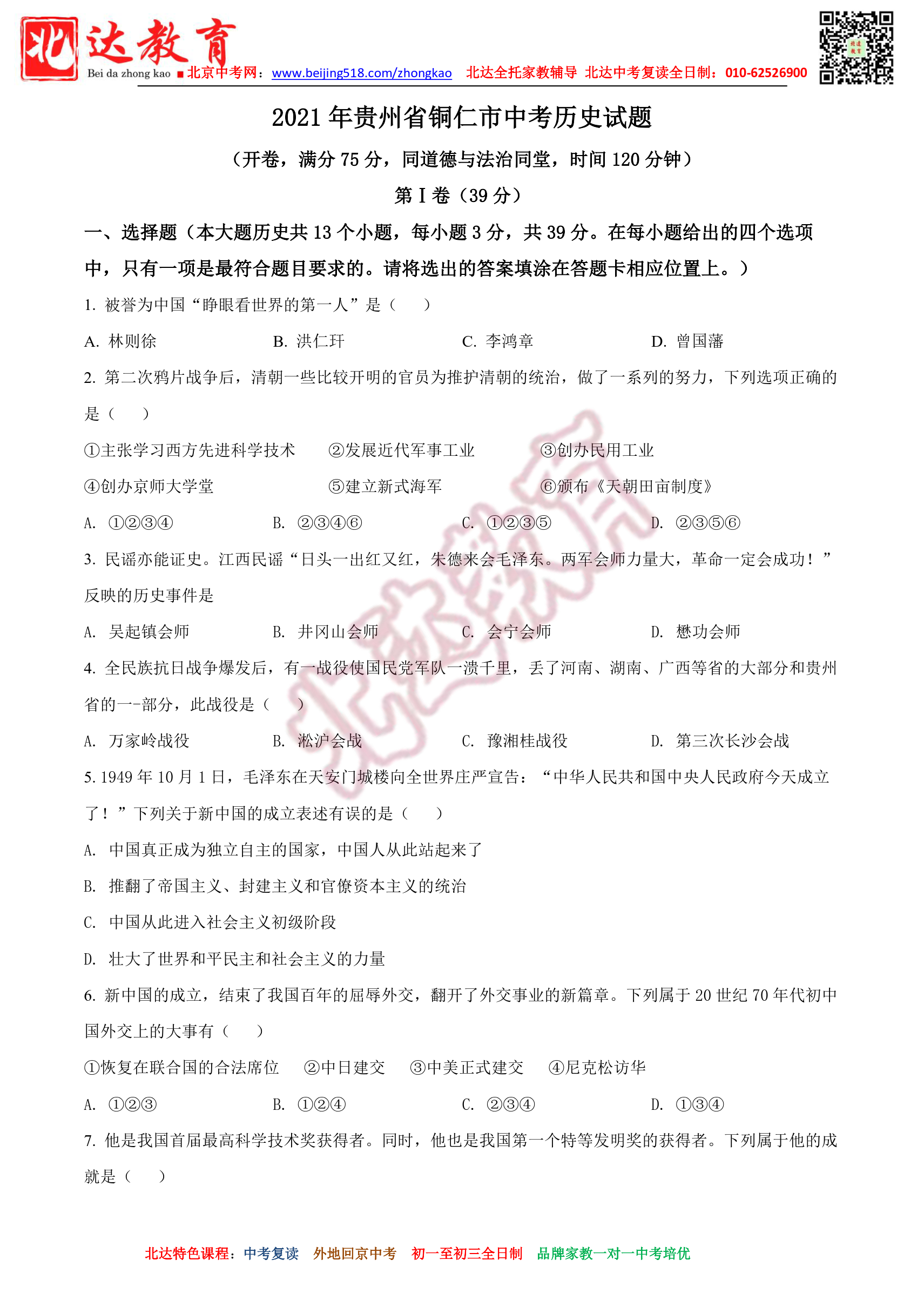 2021年贵州省铜仁市中考历史试题(原卷版)