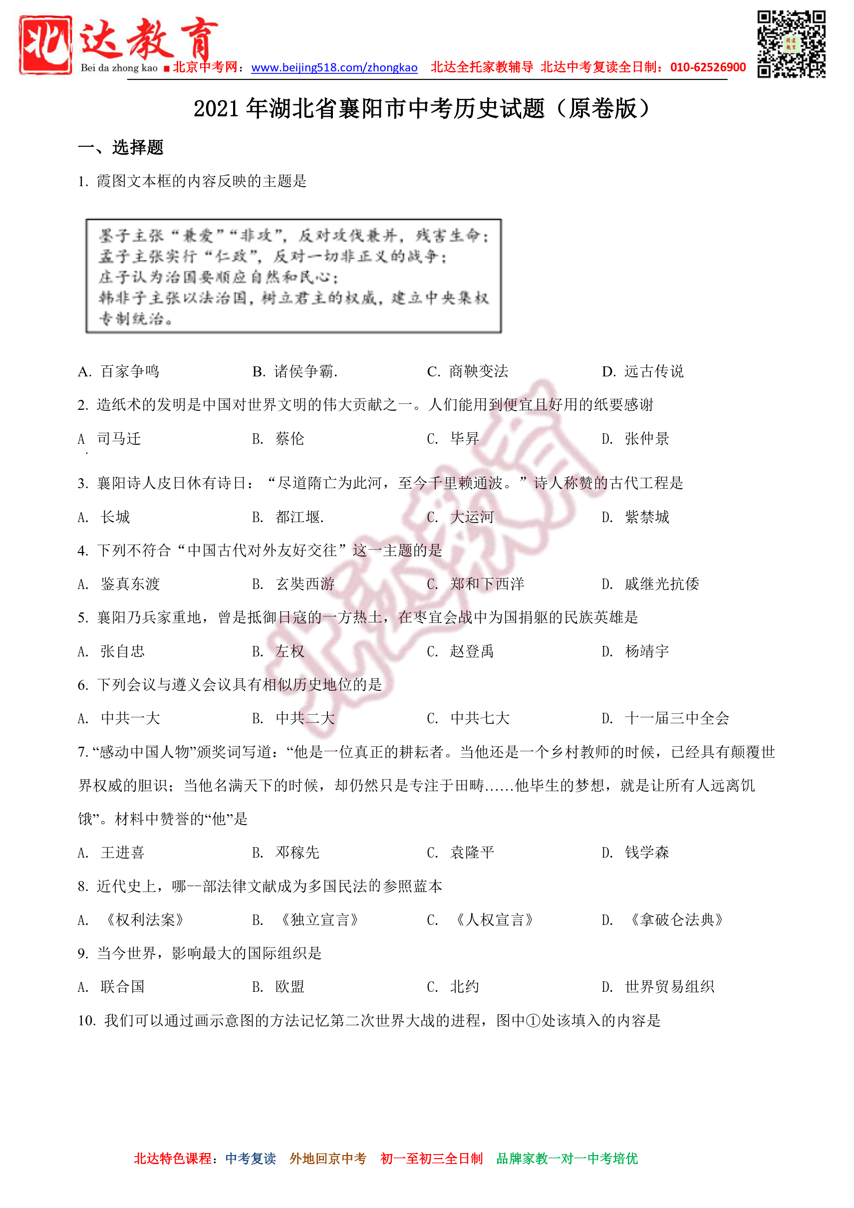 2021年湖北省襄阳市中考历史试题(原卷版)