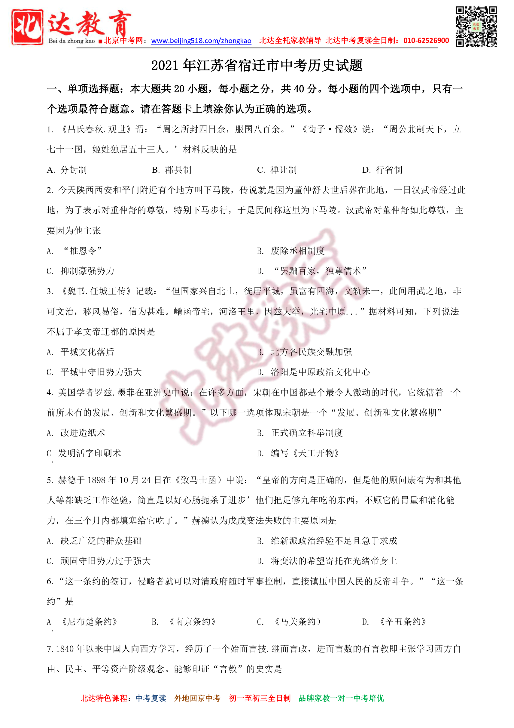2021年江苏省宿迁市中考历史试题(原卷版)