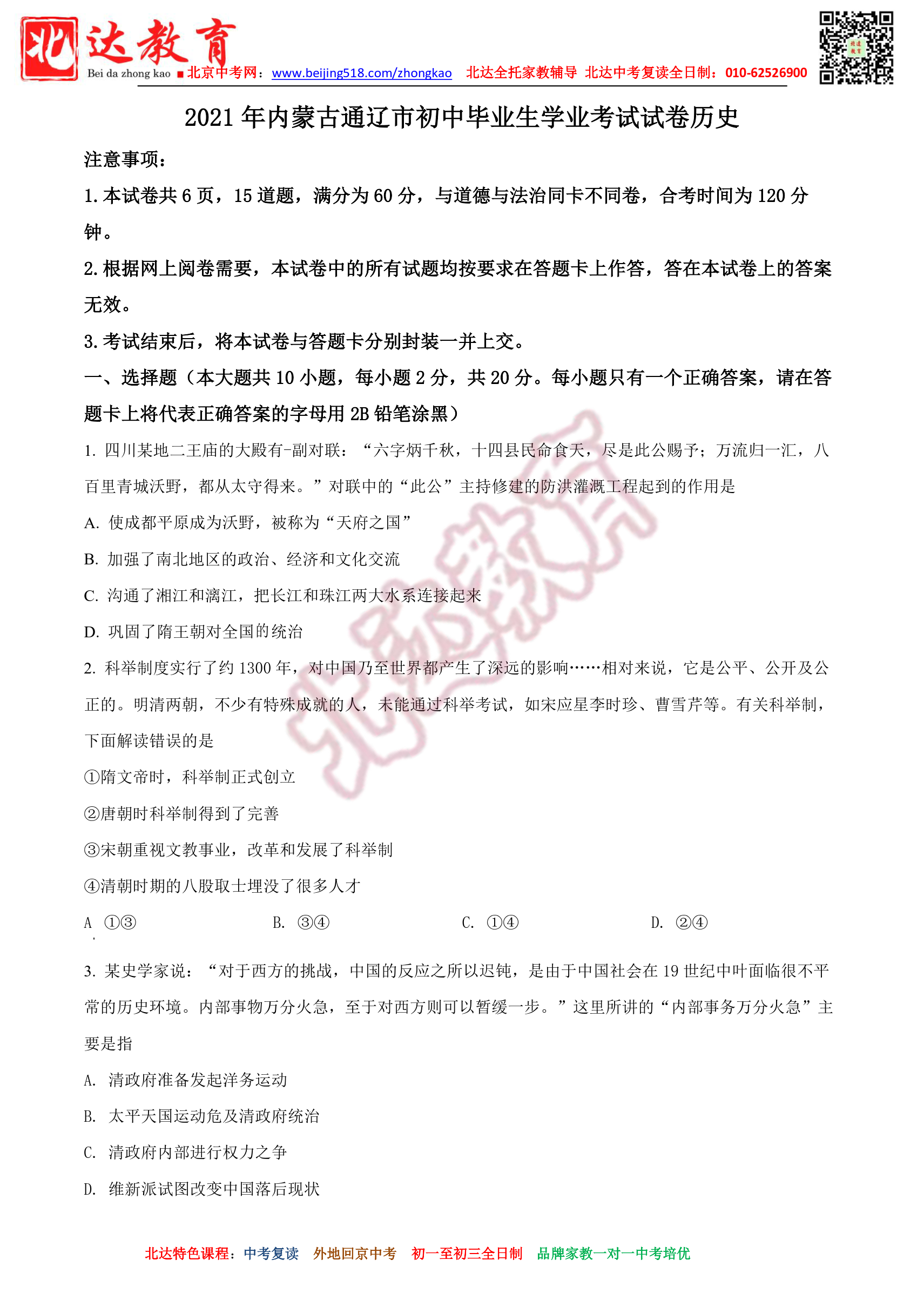 2021年内蒙古中考历史试题及答案汇总。admw360教研组收集整理,分享给大家。