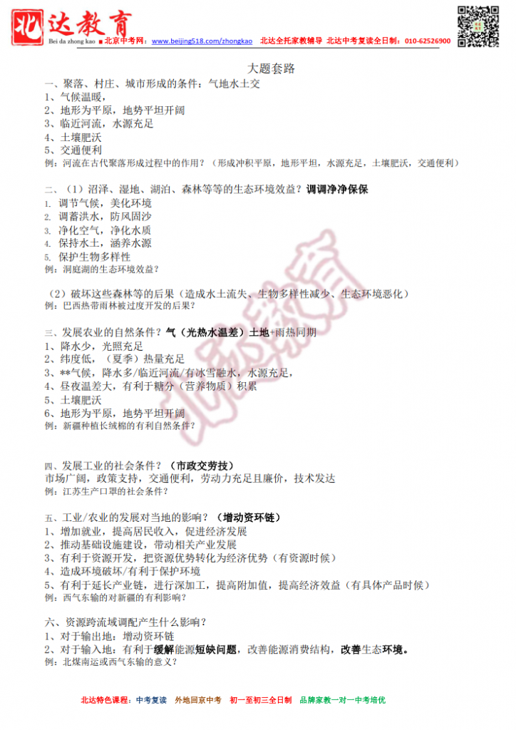 2022北京中考地理主观题高频版汇总
