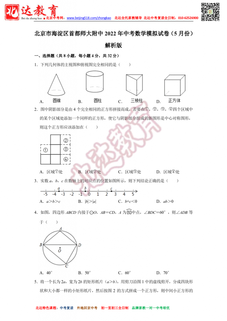 北京首都师大附中202205中考数学模拟试卷及解析(高清版)。admw360中考复读学校教研组收集整理,分享给大家。