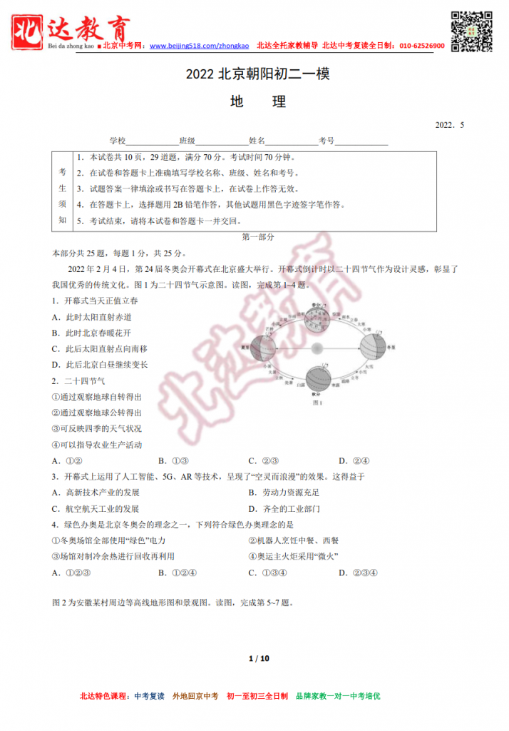 北京朝阳2022初中一模地理试题及答案(高清版)。admw360中考复读学校教研组收集整理,分享给大家。