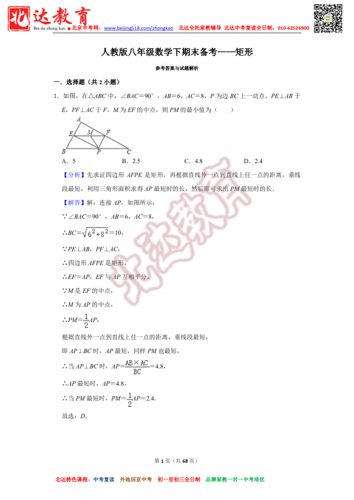 北京2022初二下期末数学备考——矩形解析版(高清版)