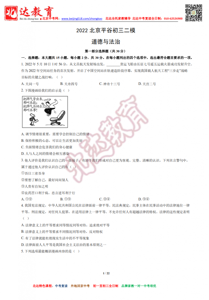 北京平谷2022初三二模道法试题及答案(高清版)!admw360中考复读学校教研组收集整理,分享给大家。