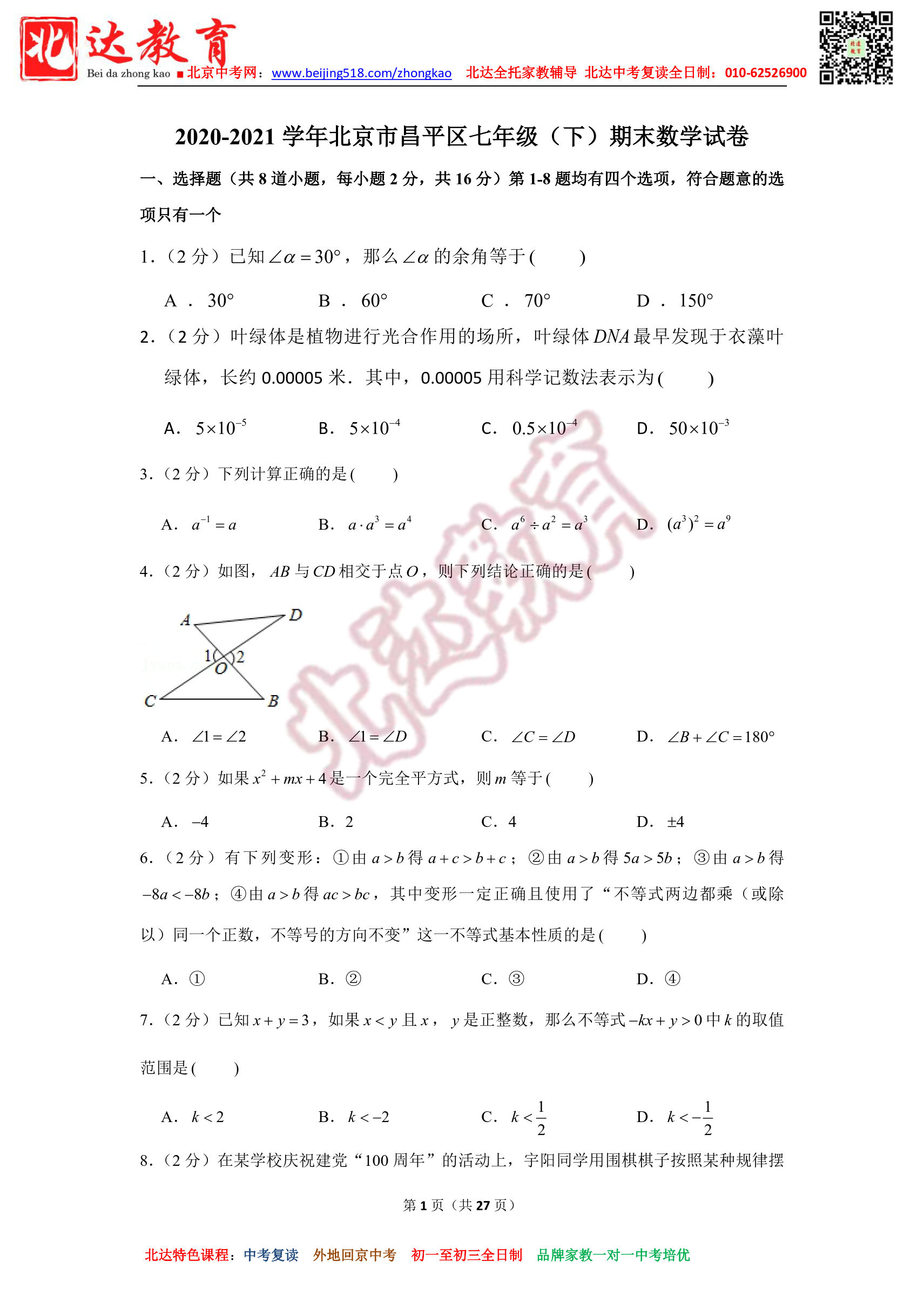 北京昌平区2020-2021学年七年级(下)期末数学试卷及解析