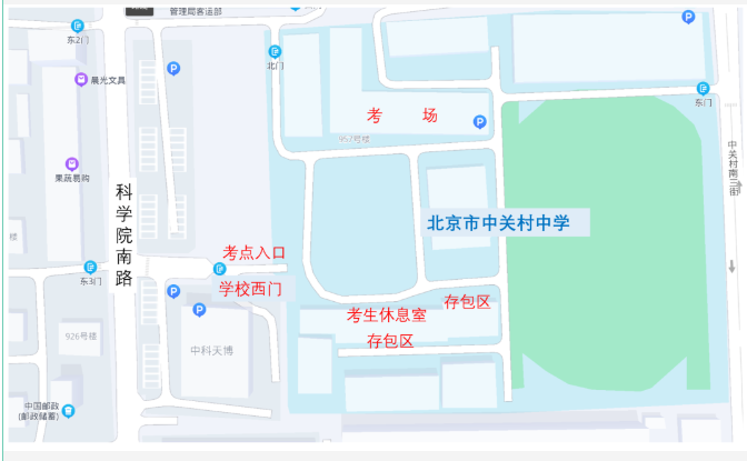 中关村中学考点校家长等候区范围为科学院南路(学校西门专用通道外左右各100米)。考生考试过程中,请家长在等候区耐心等待。等候区将按考场号划分区域,并贴有标识,散场时将有工作人员引导考生前往等候区与家长会合。请家长按照考生的考场号,依照标识在相应区域等候。