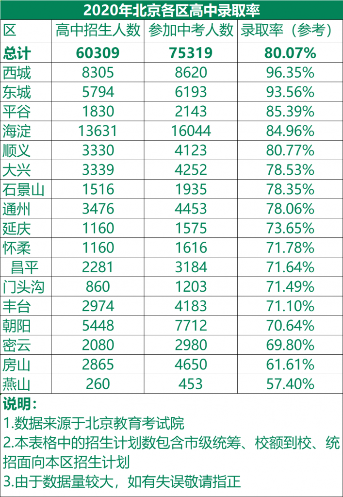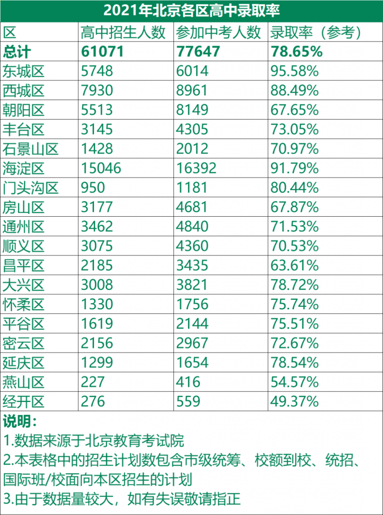 通过表中可以看出,去年北京参加中考的人数为77647人,高中招生人数为61071人,所以粗略计算高中录取率接近80%,此外,各个区高中录取率最高的是东城区,达到了95.58%,几乎可以全员上普高。其次是海淀区,海淀区高中录取率为91.79%。西城区的高中录取率为88.49%。朝阳区高中录取率为67.65%。