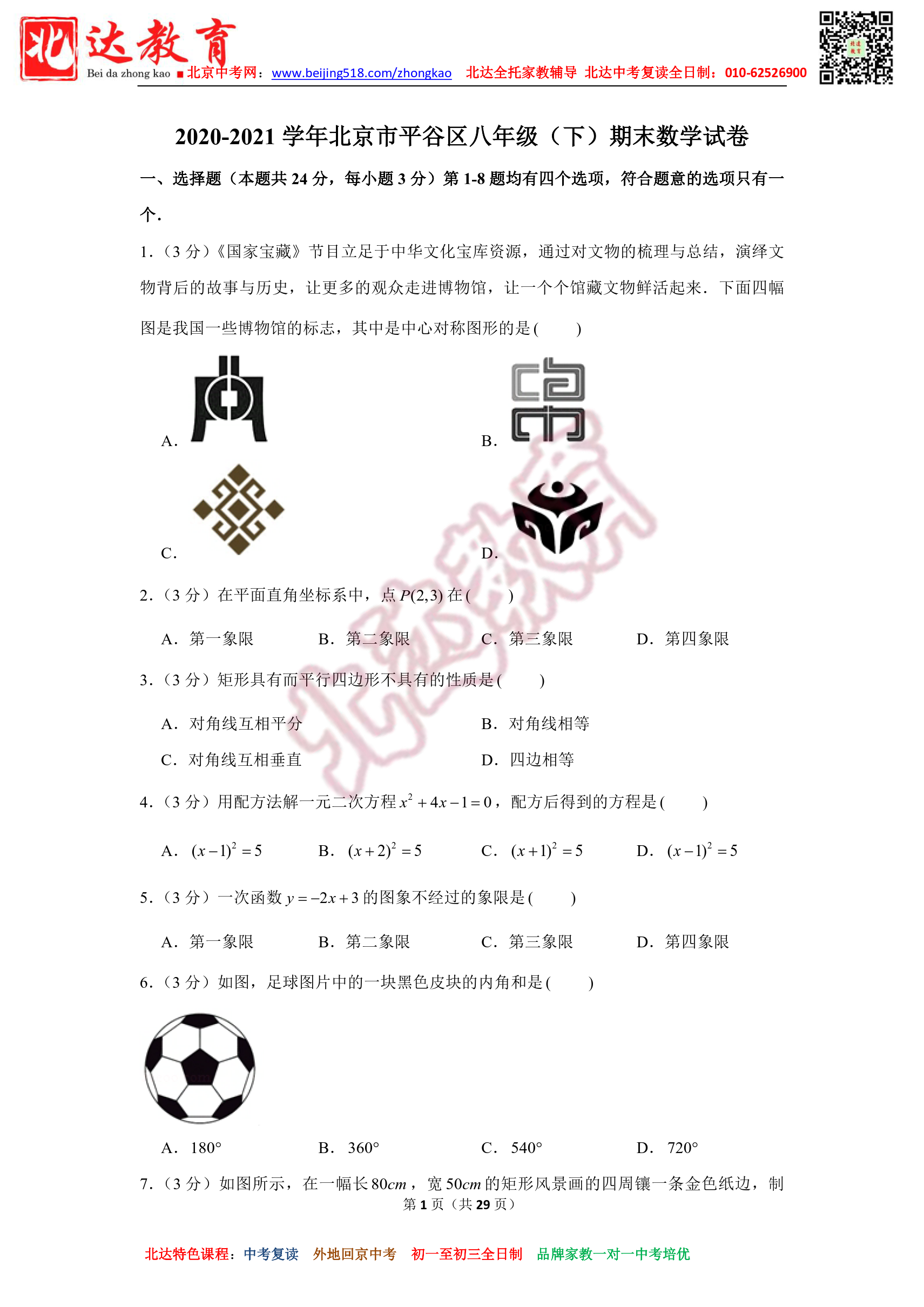 北京市平谷区2020-2021学年八年级(下)期末数学试卷及解析