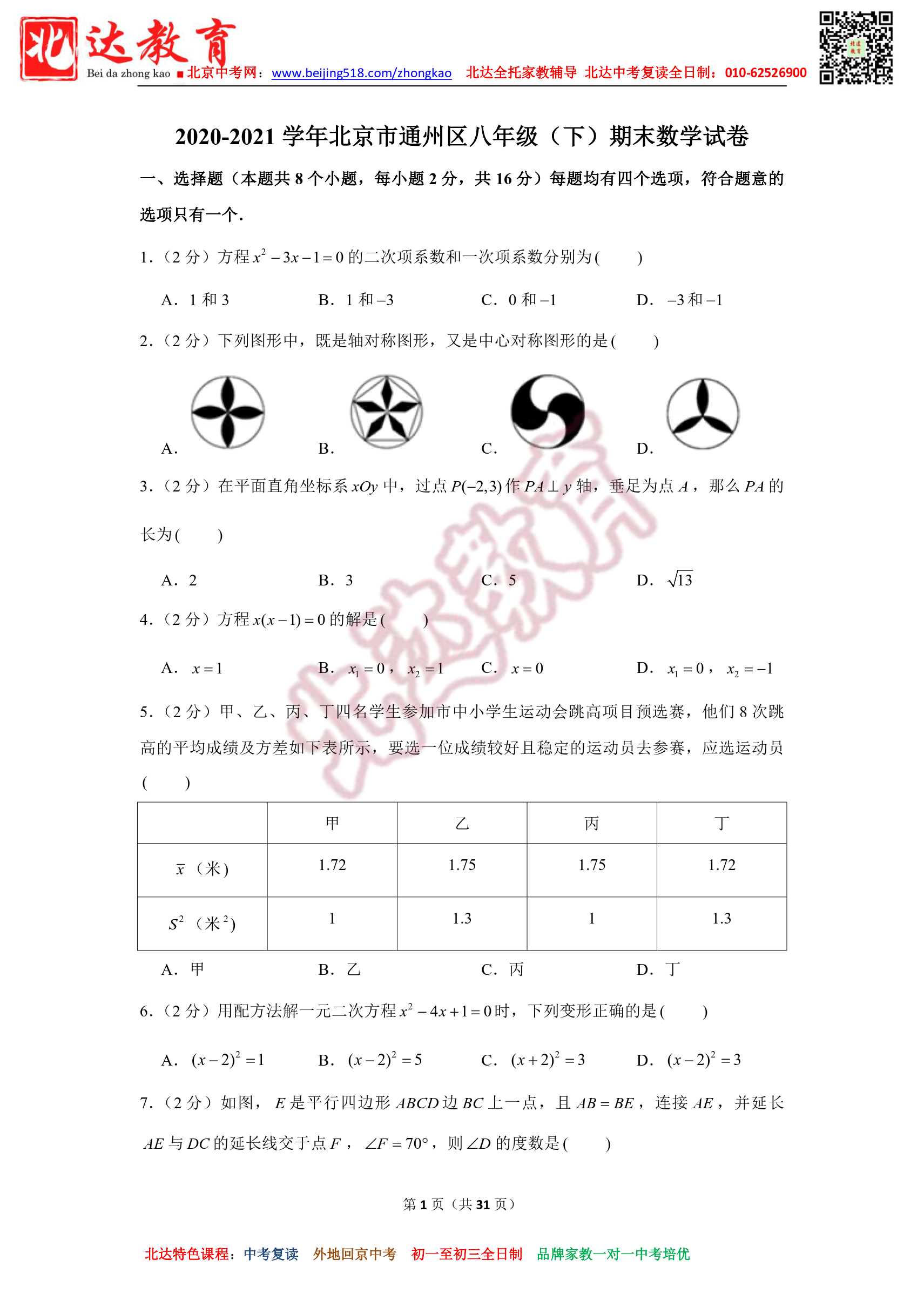 北京市通州区2020-2021学年八年级(下)期末数学试卷及解析