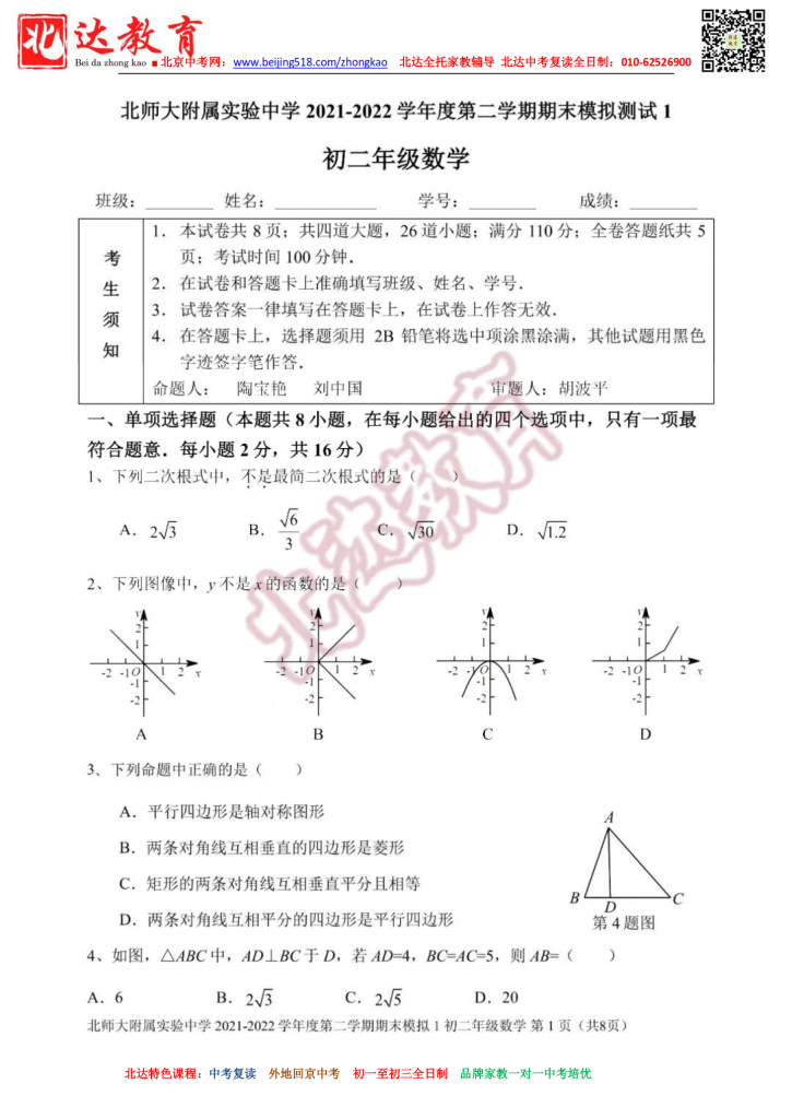 北师大附实验中学202206八下期末数学模拟试题(高清版)。admw360中考复读学校教研组收集整理,分享给大家。