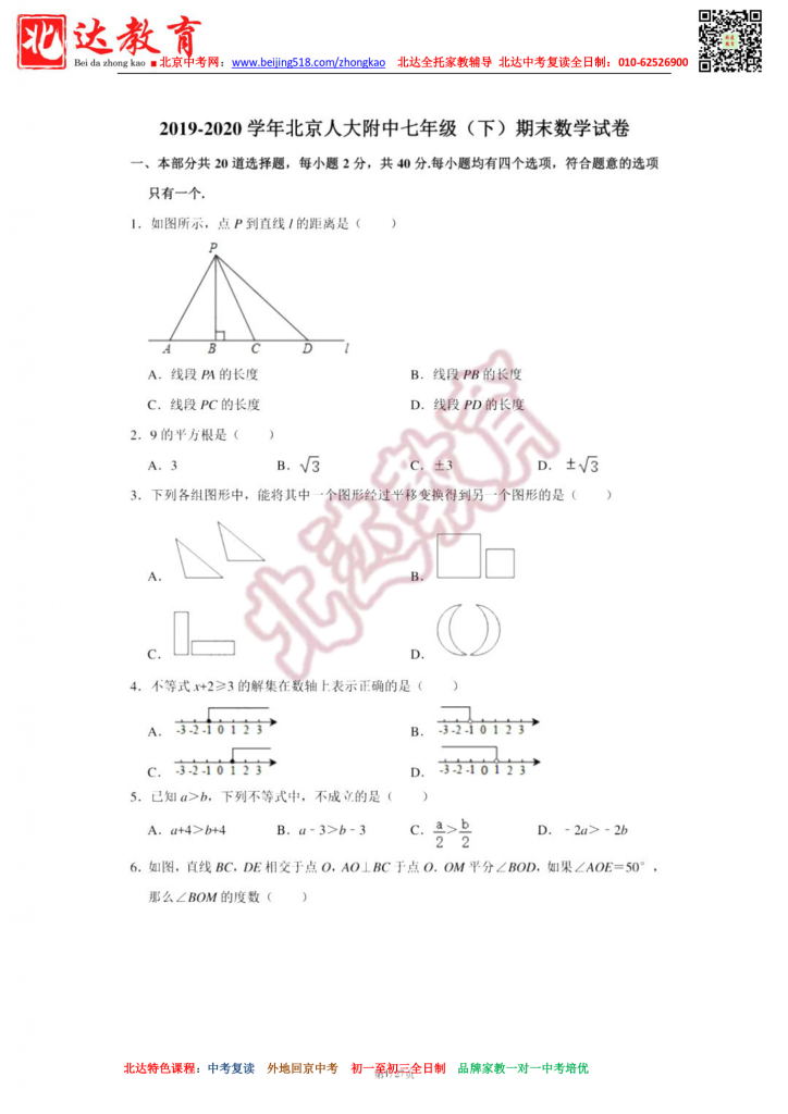 北京人大附中2020初一下期末考试数学试卷及答案(高清版)。admw360中考复读学校教研组收集整理,分享给大家。