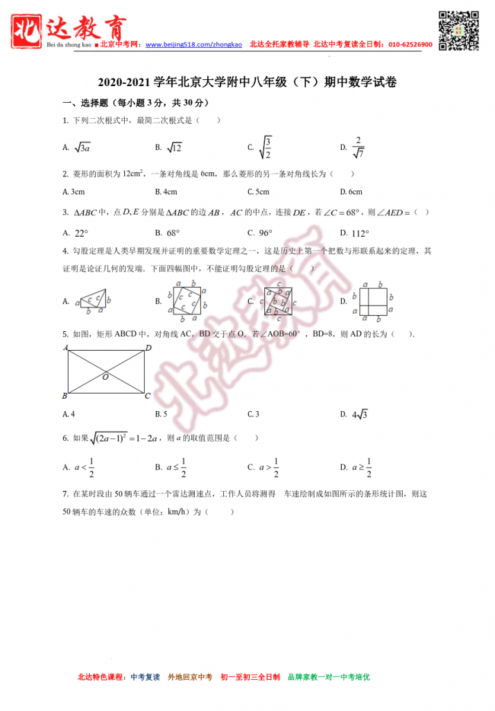 北大附中2021初二下期中数学试题及答案(高清版)。admw360中考复读学校教研组收集整理,分享给大家。