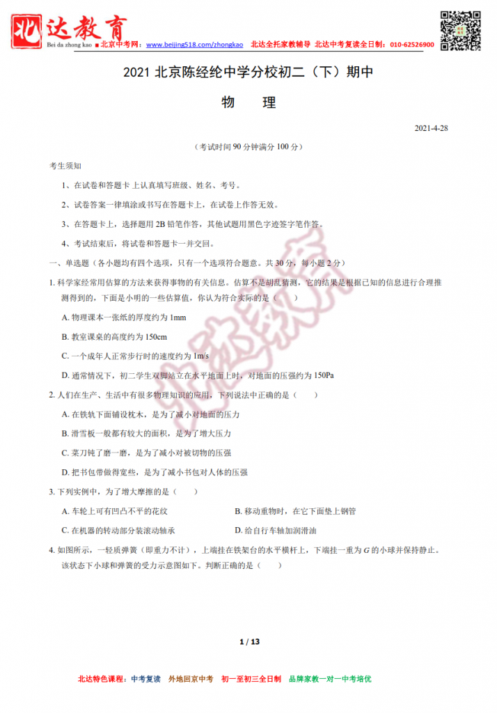 北京陈经纶中学分校2021初二下期中物理试题(高清版)。admw360中考复读学校教研组收集整理,分享给大家。