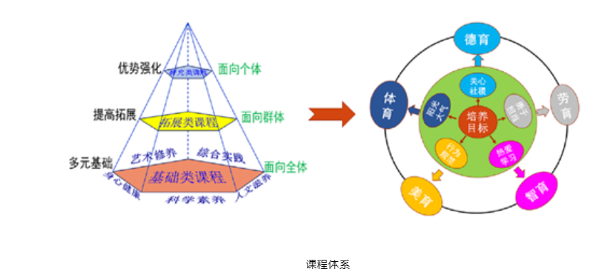 其中“一主线”是指紧紧围绕学校培养目标进行课程研发;“三层次”是指按照课程承载的任务将课程划分为基础类课程、拓展类课程和研究类课程;“五领域”是指在课程建设和实施的过程中从“人文滋养”、“科学素养”、“身心健康”、“艺术修养”和“综合实践”五大领域进行综合培养,实现与德智体美劳全面发展的有效对接。