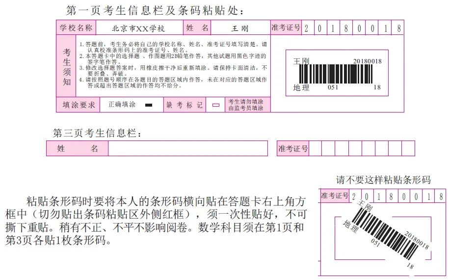 3、答题前要仔细阅读答题卡上的“考生须知”。务必用黑色字迹的签字笔将答题卡第1页左上角(数学科目还有第3页左上角)的学校名称、姓名、准考证号填写清楚,字迹不能超出框 线。考生不得自行填涂“缺考标记”栏。如下图所示: