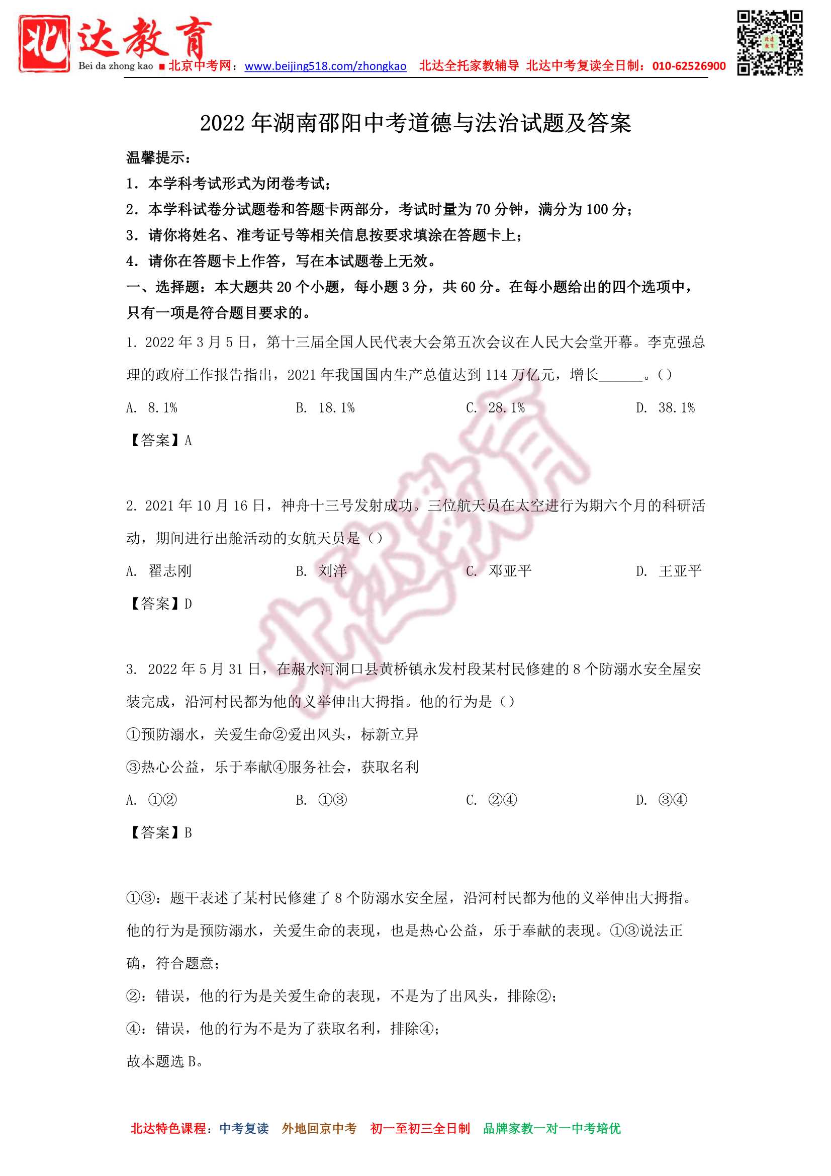 2022年湖南邵阳中考道德与法治试题及答案