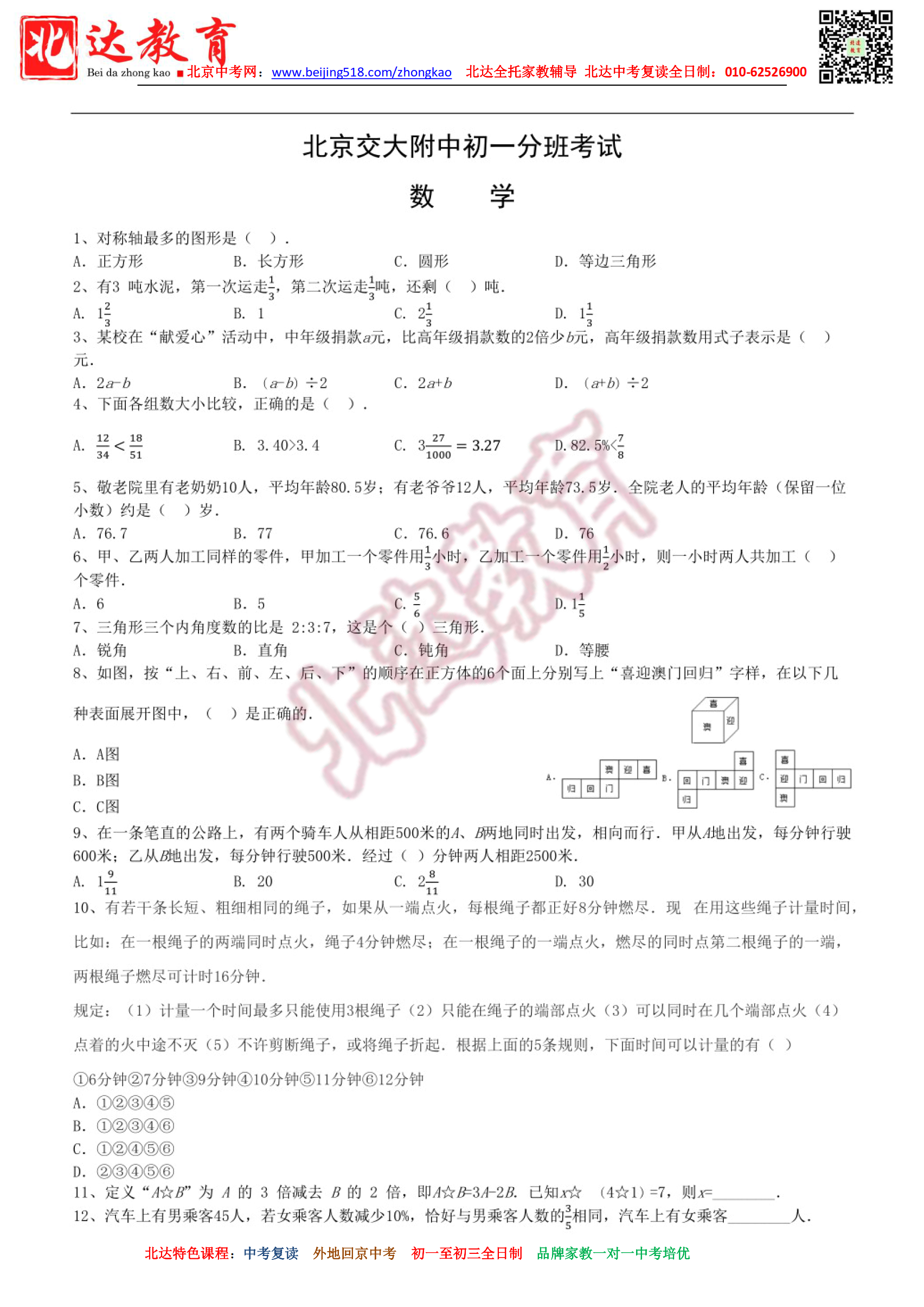 北京交大附中初一分班考试试卷及答案。admw360教研组收集整理,分享给大家。