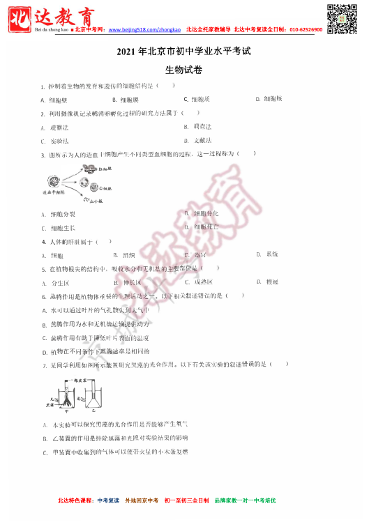 2021年北京初中学业水平考试生物试题及答案。admw360教研组收集整理,分享给大家。
