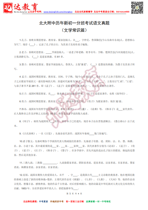 北大附中历年新初一分班考试语文真题及答案(文学常识篇)