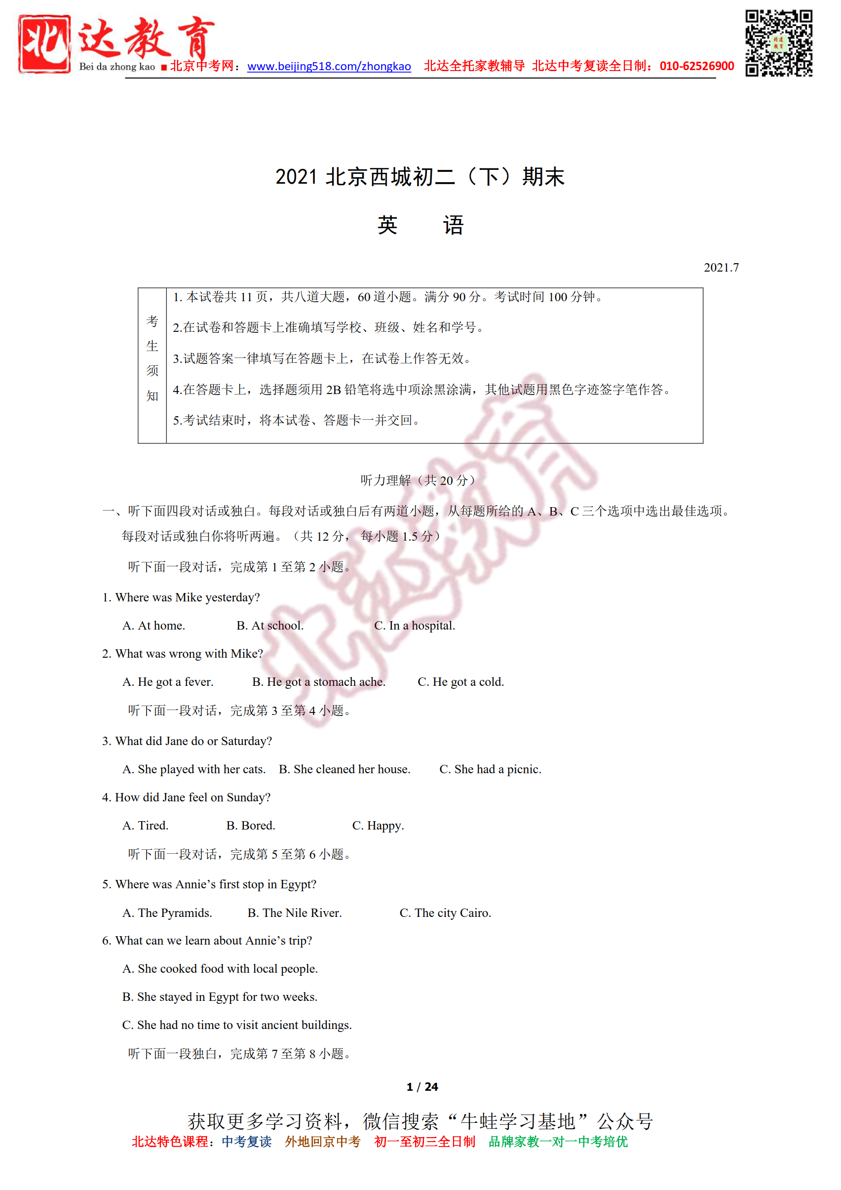 北京市2021年初二下期末英语试题及答案!北京admw360教研组整理分享相关信息,供大家参考。