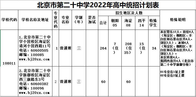 从招生计划表中我们也不难看出:今年,北京二十中学在各区的住宿名额在朝阳区有7人、海淀区35人、昌平区15人。报考北京二十中学的考生需要在报志愿的时候就报住宿,考生所在区有住宿名额就可以填报。