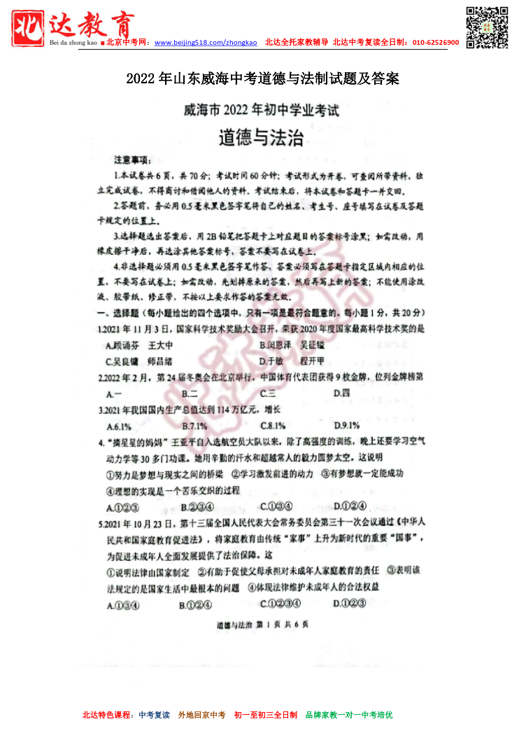 2022年山东威海中考道德与法制试题及答案.pdf