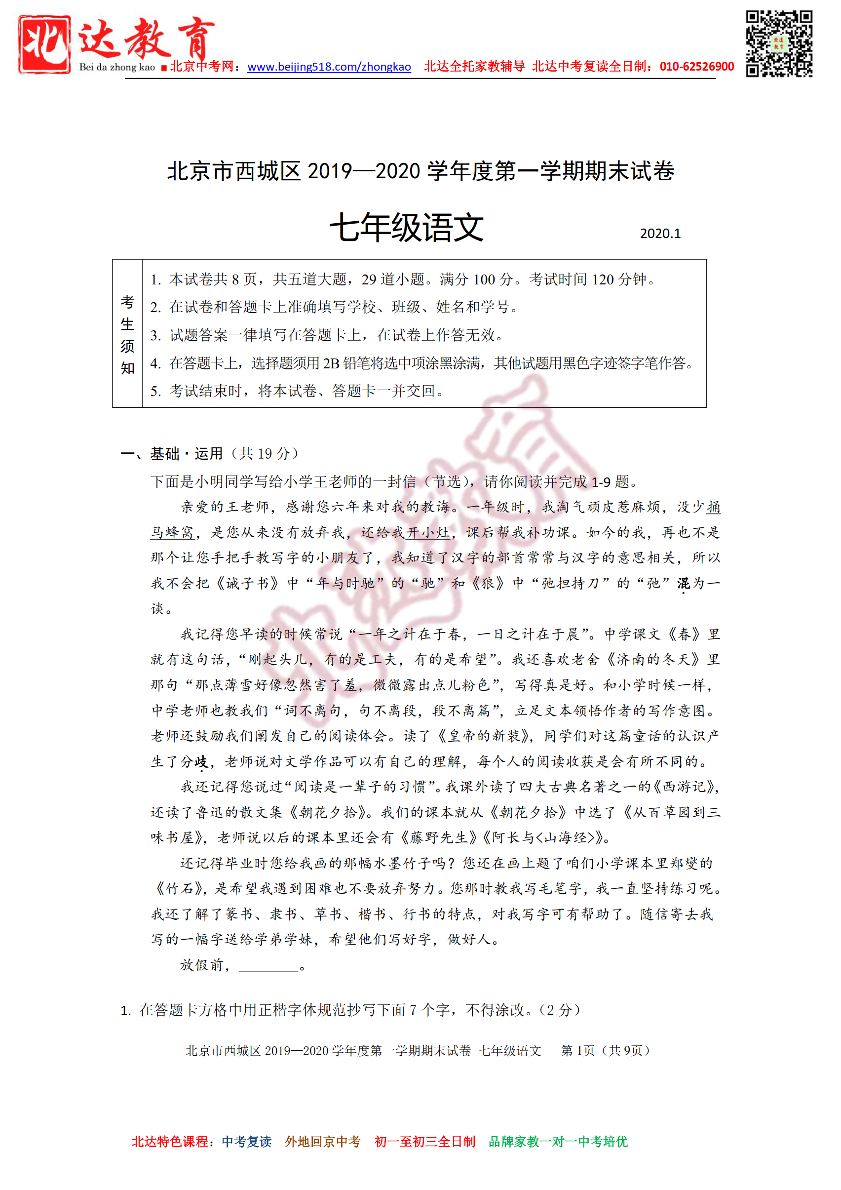 2019—2020 学年北京市西城区初一(上)期末语文试卷.pdf