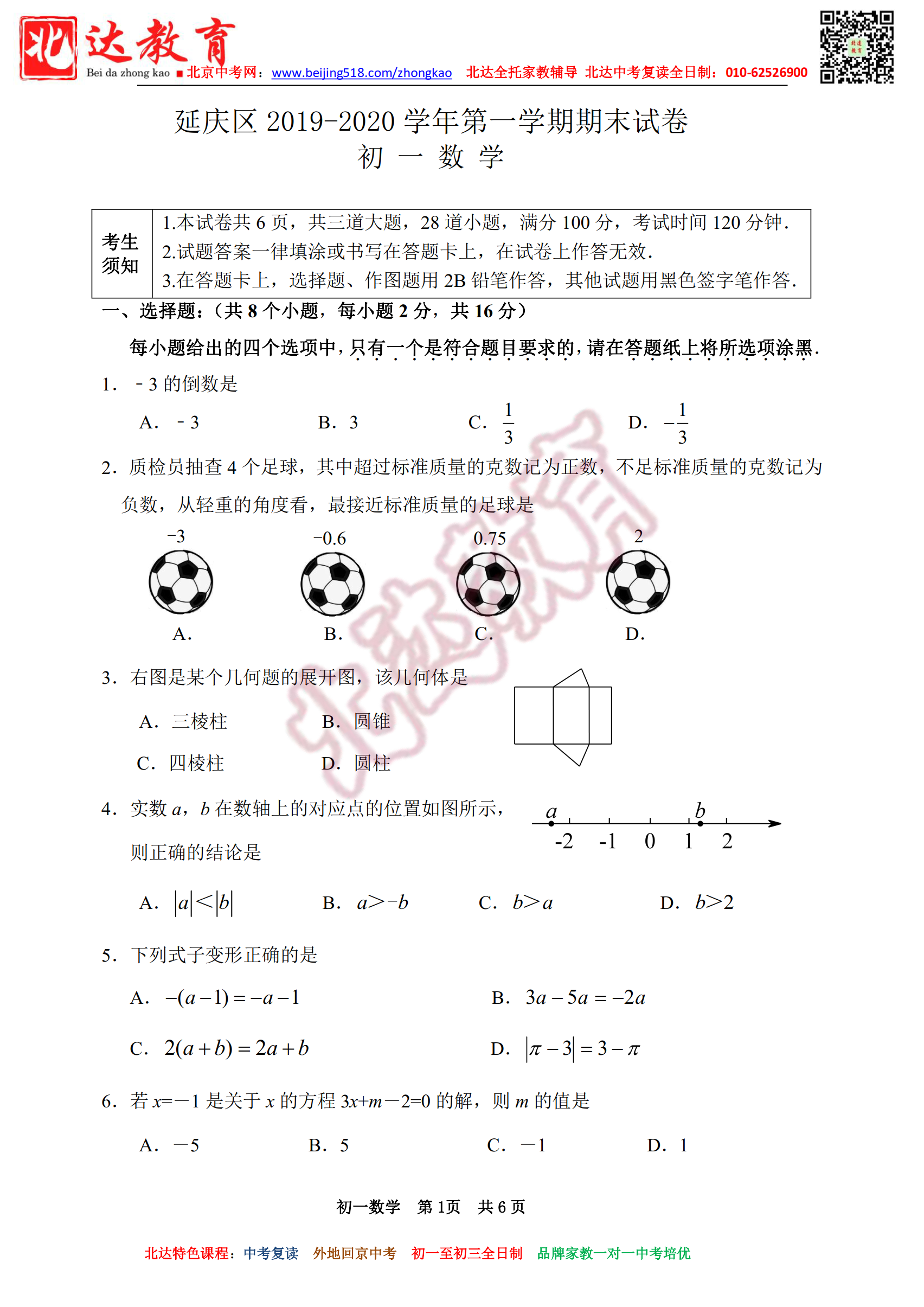 2019-2020学年延庆初一(上)期末数学试卷及答案.pdf