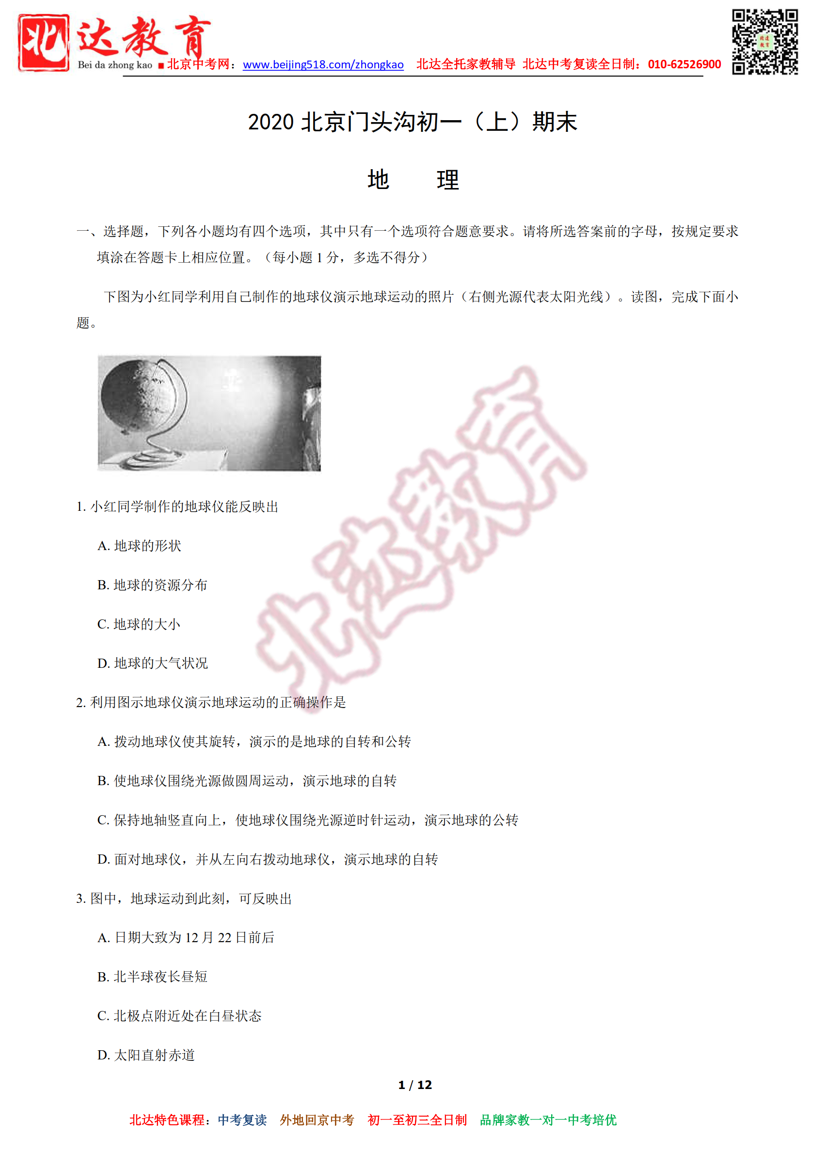 2020北京门头沟初一(上)期末地理(无答案).pdf