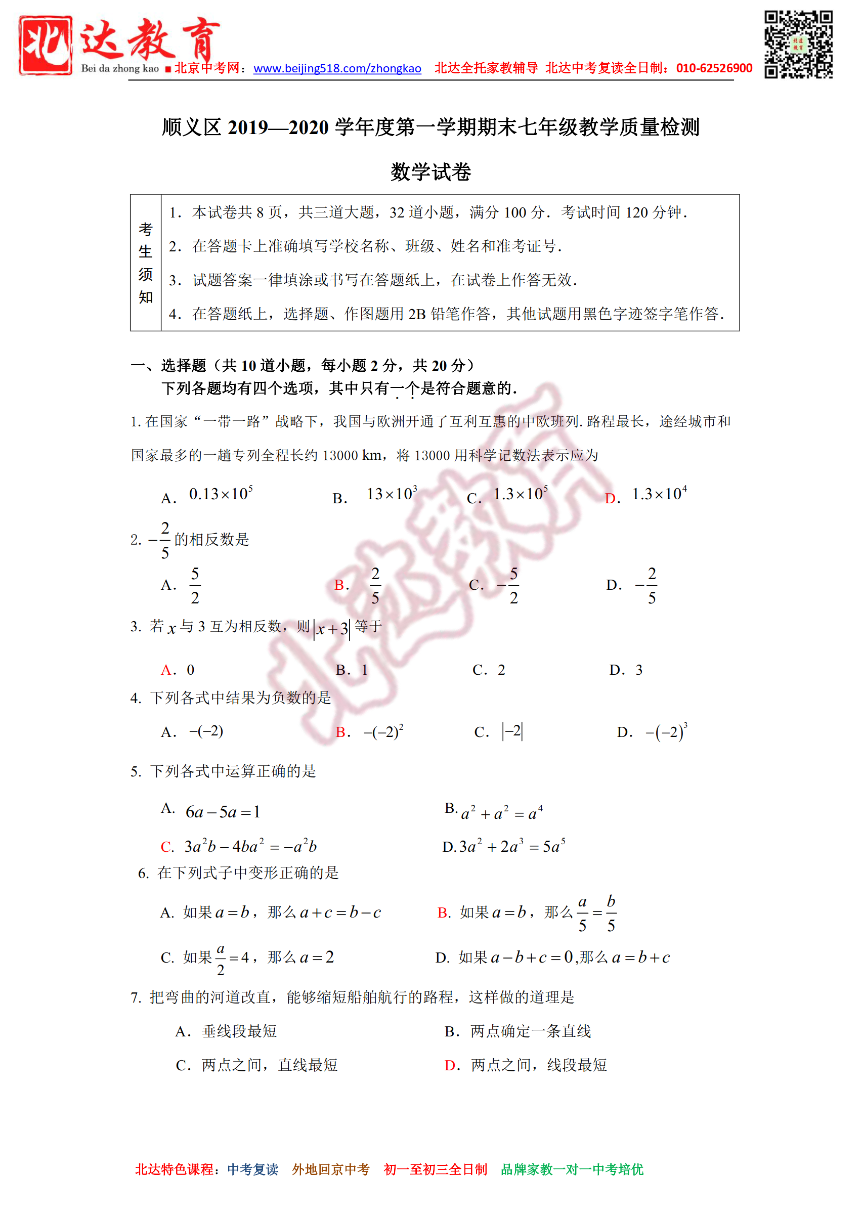 2019-2020学年顺义初一(上)期末数学试卷.pdf