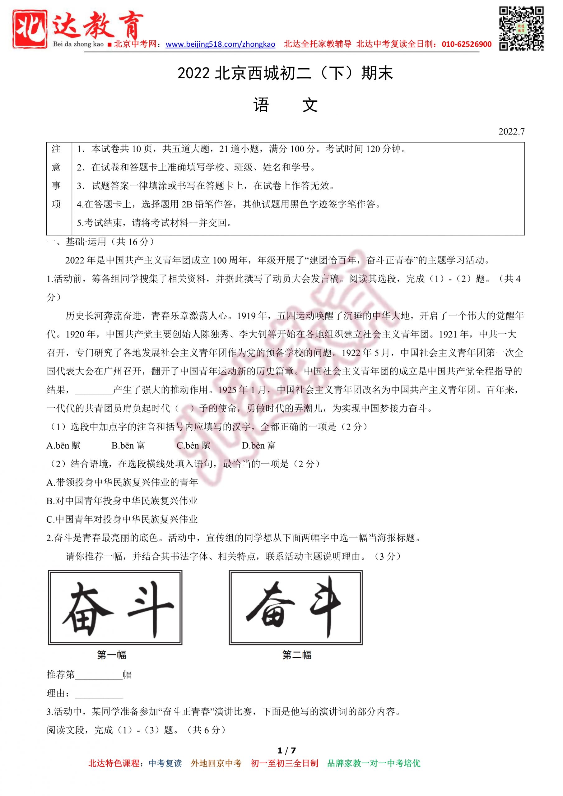 2022北京市西城区初二(下)期末语文试卷(无答案)!北京admw360教研组整理分享相关信息,供大家参考。