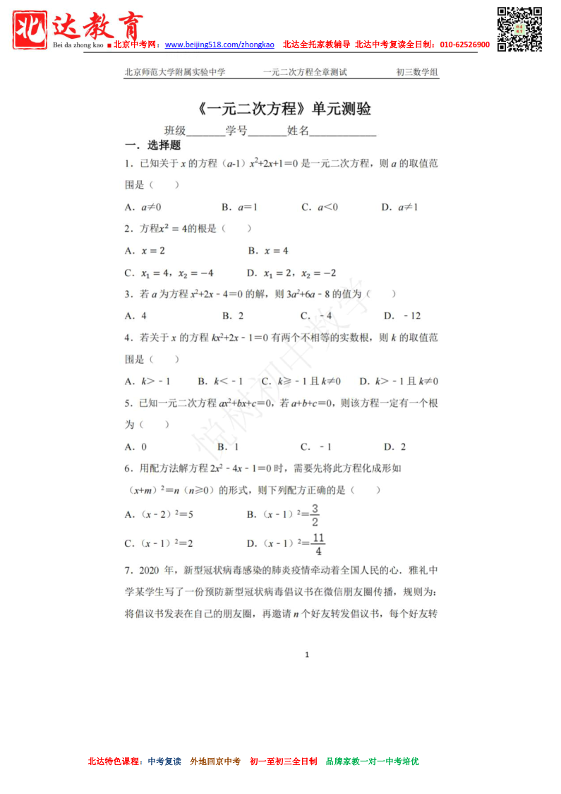 北京市2022年-2023年北师大附属初三(上)一元二次方程章测数学试卷(无答案)! 北京admw360教研组整理分享相关信息,供大家参考。