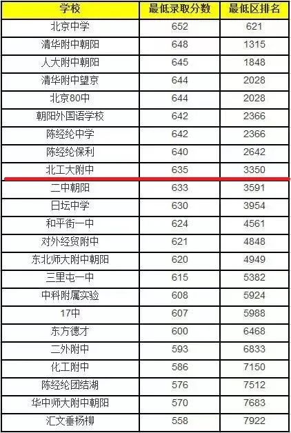 工大附中作为朝阳区老牌区重点,应该算是朝阳第一区重点,大概位于朝阳前10的位置。今年工大附中中考录取分数线635分,区排在3350名,在朝阳排名