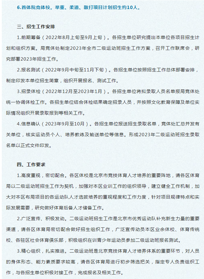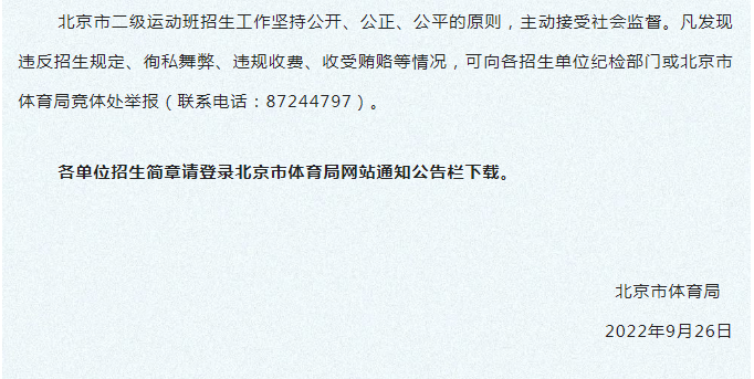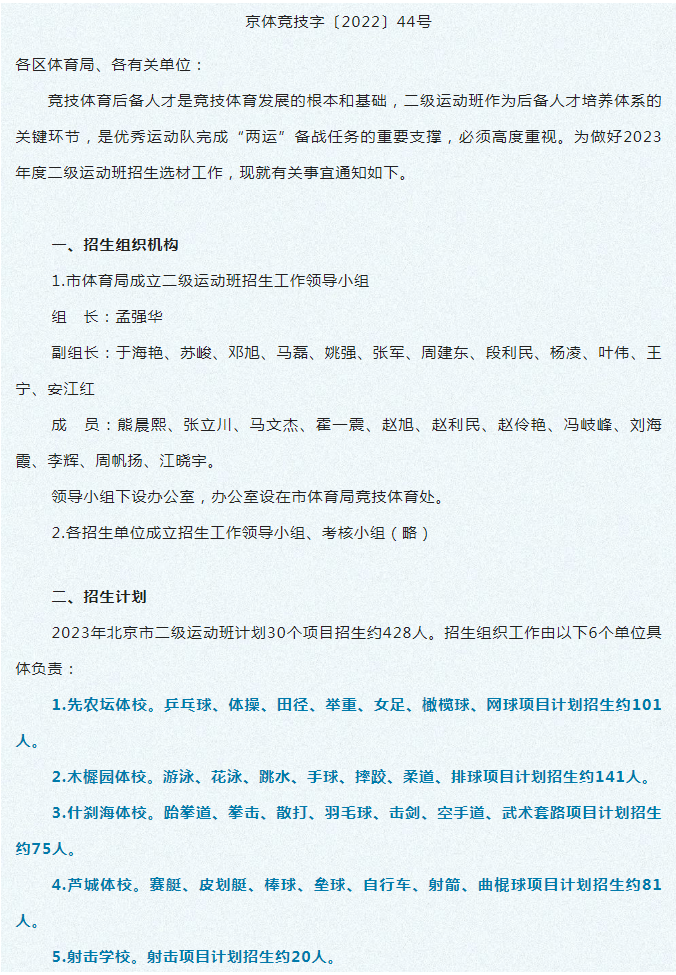 近日,北京市体育局发布了《关于开展2023年度二级运动班招生工作的通知》。通知提到,2023年北京市二级运动班计划30个项目招生约428人,最低年龄要求为5岁,部分身体素质突出者,可在计划招生的年龄段的基础上再放宽1至2岁。招生组织工作由以下6个单位具体负责。具体招生工作安排快来了解一下!