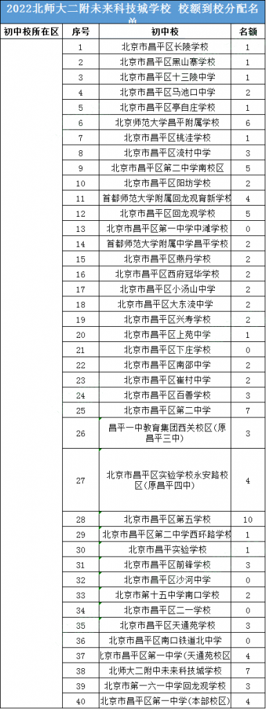 2022年北师大二附未来科技城学校有104个校额到校名额,分给了昌平35所学校。详细分配名额见上表↑↑