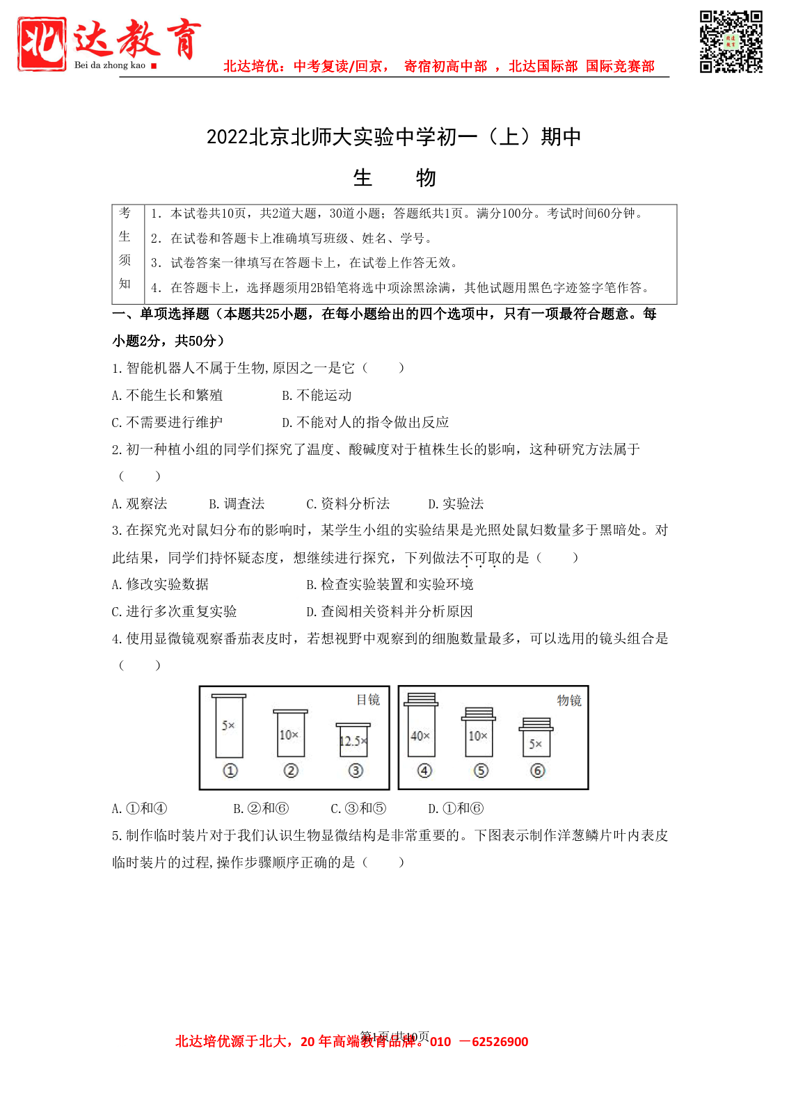 2022-2023学年北京师大实验中学初一(上)生物期中试题及答案预览: