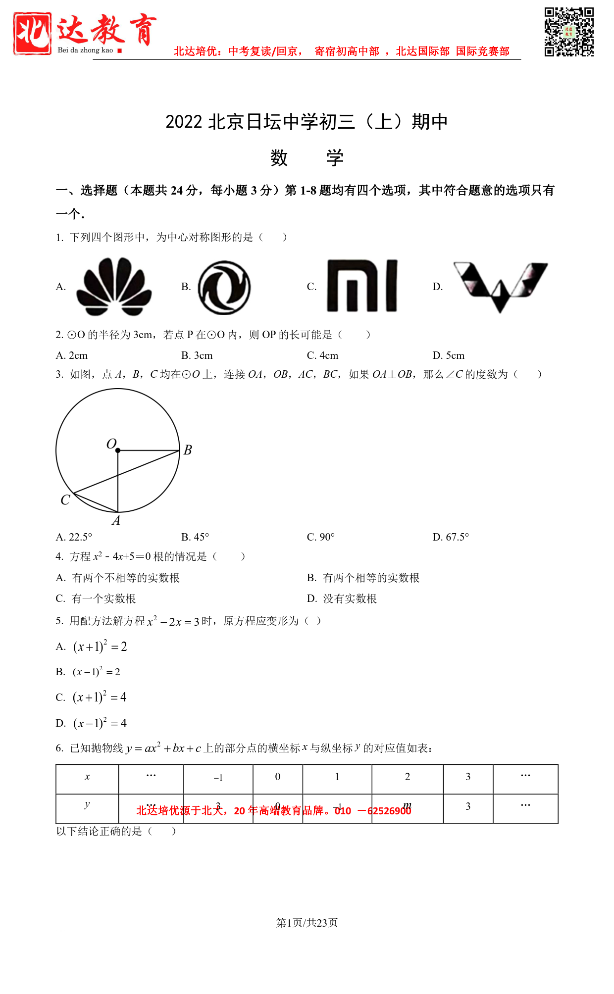 今天,admw360中考网为大家整理了2022-2023学年日坛中学初三(上)期中数学试题含答案,分享给大家。赶紧下载练习起来吧。